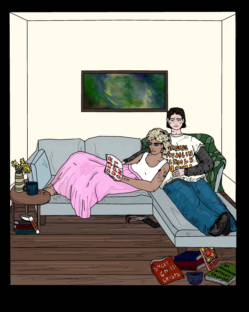 I wanted to animate a lesbian partnership in this particular example of non-monogamy, as when I was trying to think of characters it annoyed me that my default thought was of a man and a woman. This instantly made me remember scrolling through tinder, with couples popping up on my feed looking for a ‘unicorn’ to experiment with, and I didn’t want to use these characters for that particular genre of sexual activity. When talking about non-monogamy, LGBTQIA+ non-monogamy is often erased “to counter the notion that queer people were obsessed with sex and debauchery, the community put forward carefully constructed images showing how queer people could be assimilated into straight society. Polyamory had to be deleted from the community to win approval. People still assume that having multiple partners means being amoral.” I wanted to counteract this notion through the characters of El and Jay, creating a calm and happy, non-sexual environment of two people willingly entering into non-monogamy and feeling comfortable, reading The Faggots and Their Friends Between Revolutions, and falling asleep in each others arms. In a poetic article by Sara Youngblood Gregory for Salty, they write “Non-monogamy is nothing to do with sex. It is everything to do with talking, long, long talks and learning how to communicate again and again and again.” I hope El + Jay’s characters offer a fresher look at how non-monogamy can look.