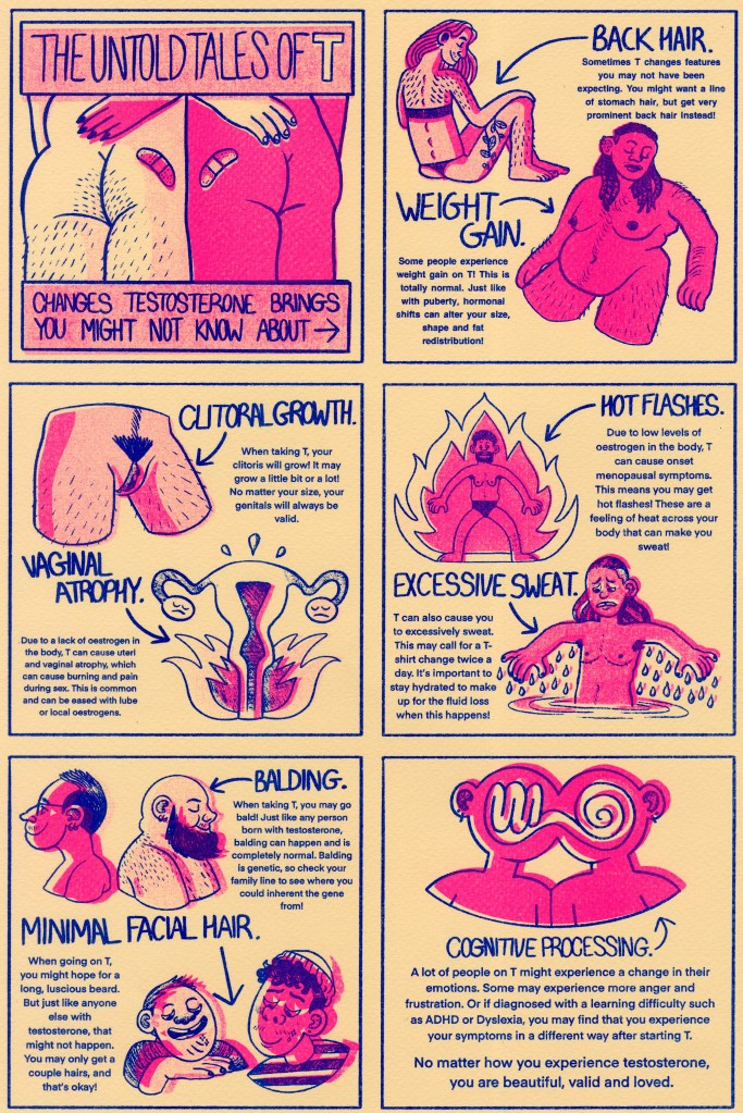 Due to the nature of social media and conventional standards of beauty, we only hear and see a small number of the changes testosterone brings. The aim of this infographic is to destigmatise these changes and give people on T the representation they need.